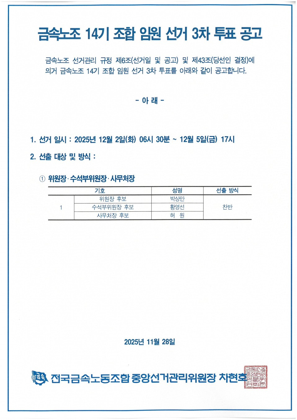 금속노조 14기 조합 임원 선거 3차 투표 공고